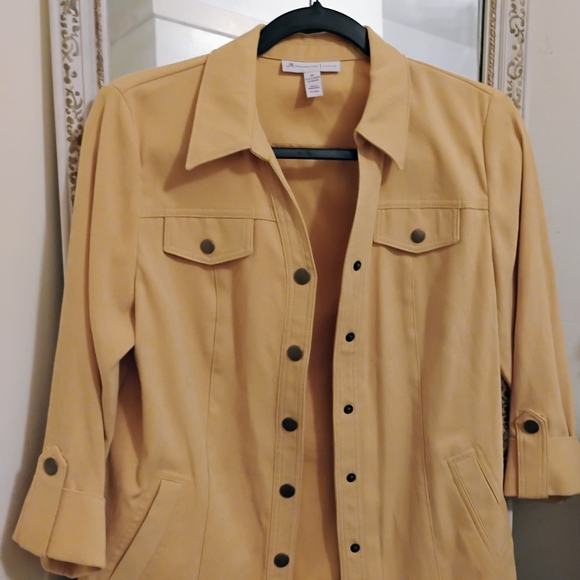 This JM Collection utility / jacket in a versatile banana-ish shade offers a structured yet comfortable fit, perfect for casual outings. Its lightweight material makes it ideal for layering, ensuring both style and practicality.