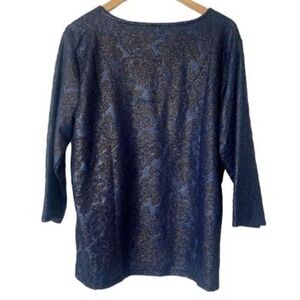 A versatile solid color with pizzazz, this JM Collection top features a jacquard print with glittery accents. Relaxed fit Scoop neckline with hardware 3/4-sleeves Polyester/spandex Machine washable Imported Web ID: 11296353Size: Womens M Condition: New With Tags