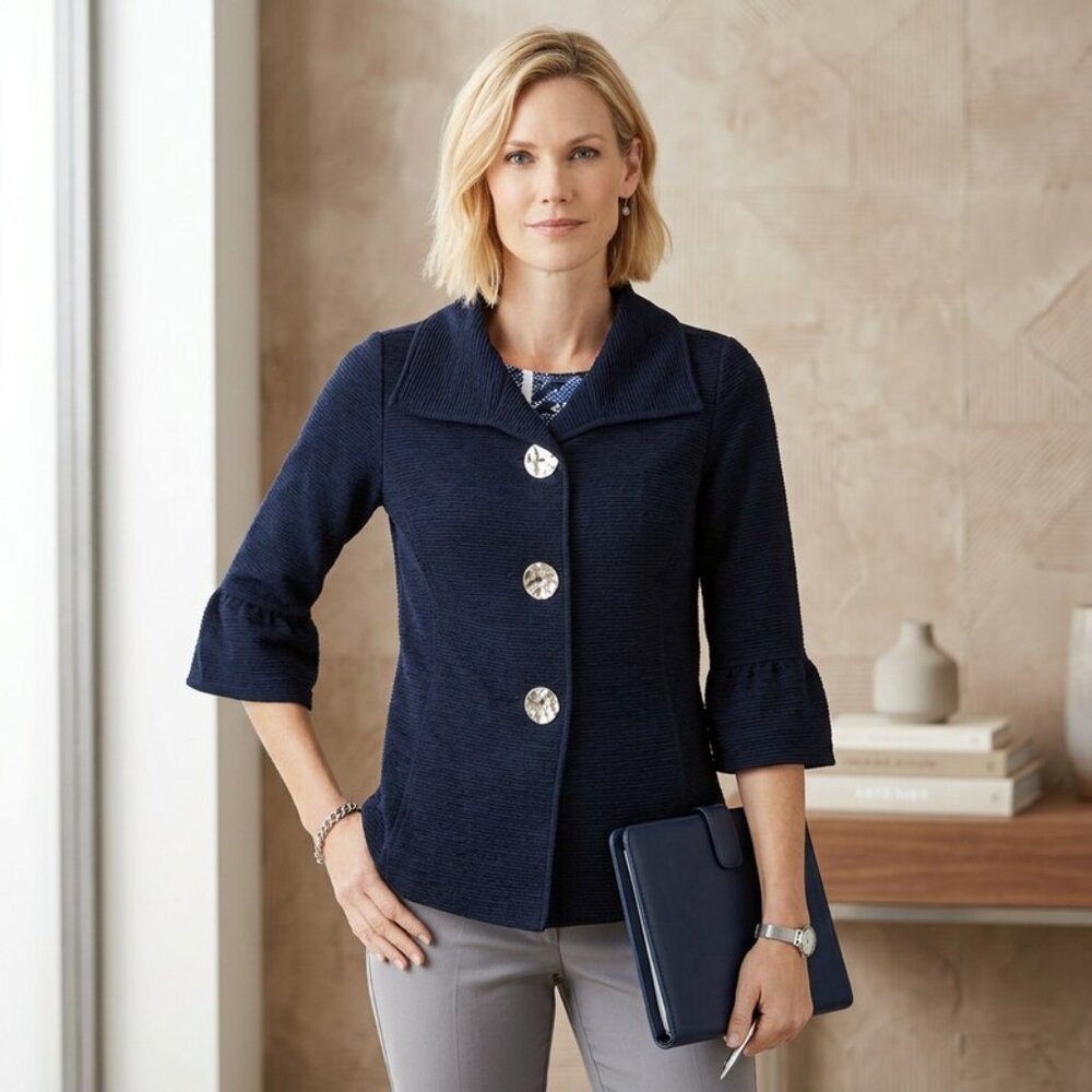 JM Collections timeless textured jacket features hammered buttons and three-quarter sleeves with flare. Approx. model height is 510 and she is wearing a size small Relaxed fit; hits at hip; approx. 25-1/2 long Due to generous sizing, we suggest sizing down for the perfect fit Lapel collar; three button closures at front Allover texture 3/4-bell-sleeves Same Great Fit. Same Great Brand. New, Fresh Label Polyester/spandex Machine washabl