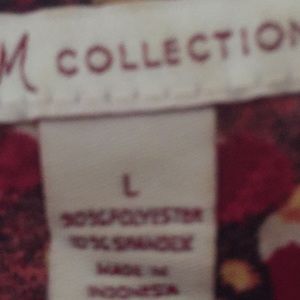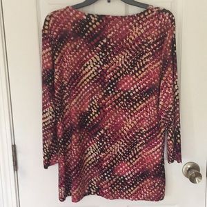 Three quarter length sleeves, scoop neckline top. Pretty burgundy, black, caramel and rose tones. Cute with black pants or jeans. Length from top seam at shoulder to bottom approximately 26 inches.