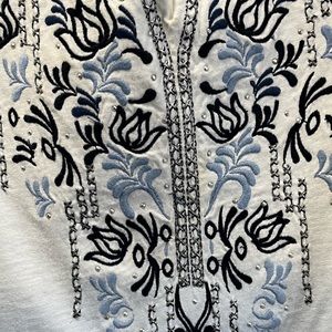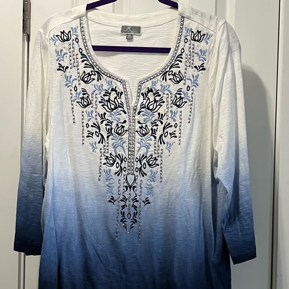JM Collection Women’s Top, 3/4 sleeve, Color- White & Blue, size- 0X, excellent condition.