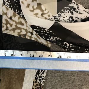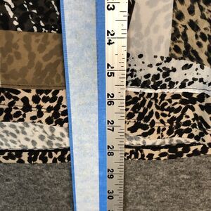 This is a JM Collection tunic top in size XL with a leopard print design. It features 3/4 bell sleeves, a V-neckline, and studded accents. The top is lined, made of polyester with a spandex lining, and has a sheer printed overlay. It has a bohemian style with a knit fabric type. This versatile blouse is suitable for various occasions and seasons, offering an easy-care and stretchy fit for all-day comfort.