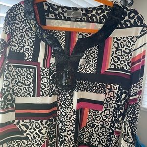Tunic style Large blouse with black sequin accent around front neckline. 3/4 sleeves.