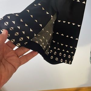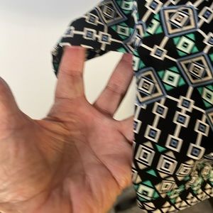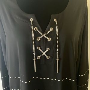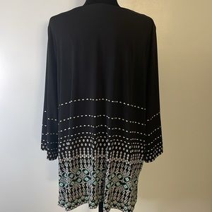 This black JM Collection tunic is beautiful with white and teal geometric accent pattern. Silver lace chain on front with pretty silver tassels. Side split. 3/4 length sleeves. Like new.