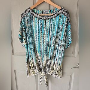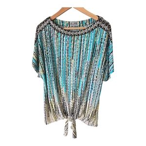 JM Collection Tunic Blouse Women 1X Blue White Tie Front Stretchy Colorful