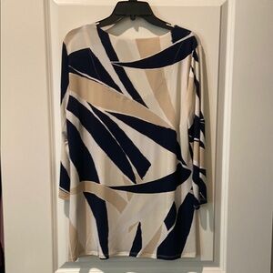 JM Collection Tunic Top in Navy, Ivory, Tan Abstract Print, Neckline Contrast Detail with Hook & Eye Close, 3/4 Sleeves