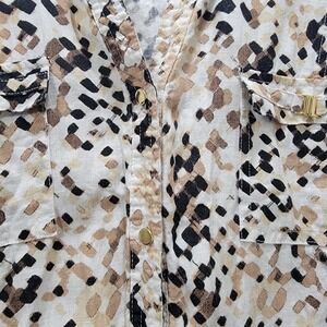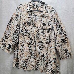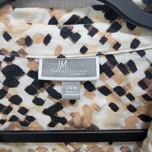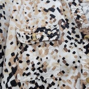 The JM Collection Woman 24W 100% Linen GOLD Buttons botton Up 3/4 Sleeves Tunic Lagenlook is a stylish and versatile top suitable for various occasions such as travel, weddings, parties, casual outings, formal events, and business meetings. This V-neck tunic features gold buttons for a trendy accent, woven linen fabric for breathability and comfort, and a relaxed fit for a flattering silhouette. With its 3/4 sleeves and lightweight design, this blouse is perfect for all seasons, making it a must-have piece in any woman's wardrobe. Made with high-quality materials and a hint of animal print pattern, this tunic embodies a blend of classic and bohemian styles.