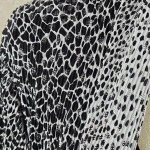 This piece is very versatile. The jacket is a black and white animal print with a metallic silver highlight throughout. Attached on the inside is a black tank with a beaded embellishment along the scoop neckline. Rounded front hem on the jacket. 3/4 sleeves. Adjustable shawl collar. Pairs easily with pants.