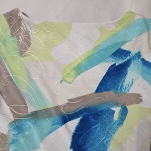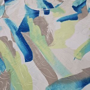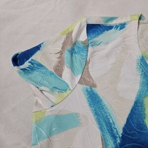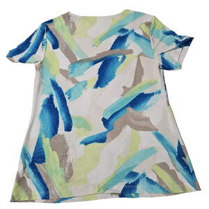 This JM Collection womens blouse is a size PM and features a multicolor colorblock pattern. The top is made from a 90% polyester blend and has a basic, pullover design with short sleeves and stretch for comfort.