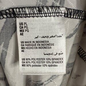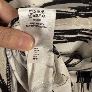 Crafted from 100% recycled material, this top features an abstract black and white print with textured details, offering both style and sustainability.