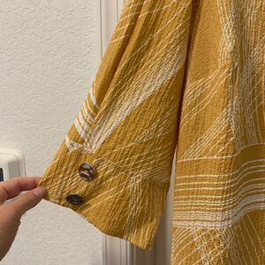JM Collection Women’s Printed Saffron Gold Top.  Size: 1X.  Zipper front V-Neck.  Silver button details on the sleeves.  Great top for work or casual!  Side slits.