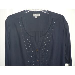JM Collection Womens V-Neck Roll Tab Sleeve Crochet Button Front Top Blue XL $50