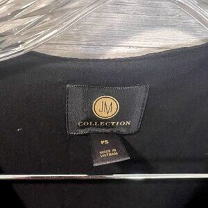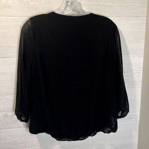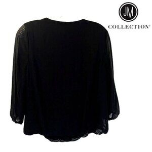 Elegant JM Collection blouse featuring a V-neckline and mesh trim. Designed with long sleeves, this pullover top combines sophistication and comfort, perfect for any occasion.