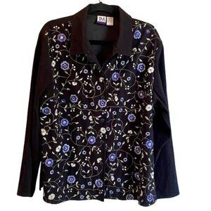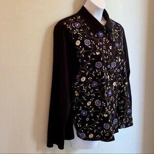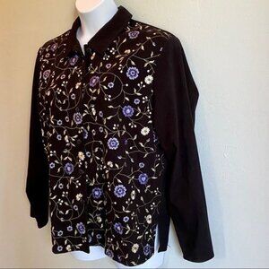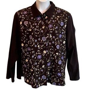 JM Collection XL Button Up Long Sleeve Black Top with Purple Flowers