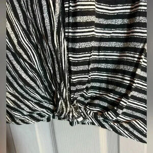 JM Collection black & white striped top created for Macys. Has a knot -front hem, easy fit-fits at hip. NWOT. Women’s size Medium. 100% Rayon. Machine Wash cold. P2P 22.25 inches length length 20.75 inches SFPF HOME