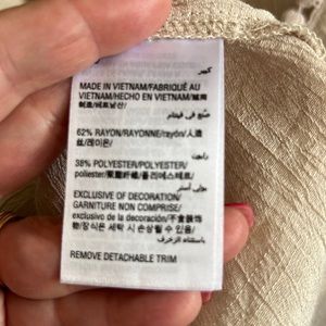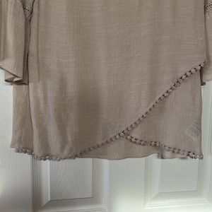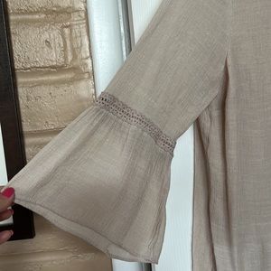 JM Collection blouse from Macys. Worn twice. Pretty sand color. 3/4 bell sleeve with nice lace detail. Lightweight fabric for summer. Cute with jeans, capris, skirts or shorts! From pet / smoke free home. Fast shipping