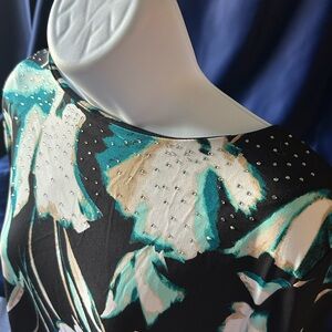 Black background with white, teal, and turquoise flower pattern on front and back. Front side has jewel accents. Boat neck colar and 3/4 sleeves. 95% polyester 5% spandex. Machine wash cold water. Bust 44 inches length 30 inches.