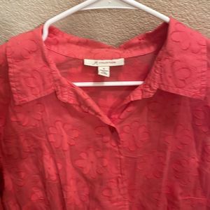 Blouse. 3/4 quarter sleeved with ties on the end of sleeve. 💯 %cotton with sewn outlined flowers. A pretty bright coral color. Flattering slits on the side of shirt to fit around hips nicely! EUC has been worn only a couple times and you can tell it has not been worn much at all! Make an offer today!!!
