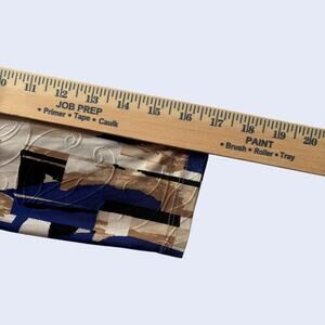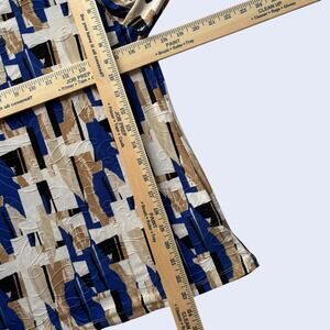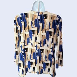 Geometric abstract knit top in blue, tan, black, and cream with a scoop neckline and 3/4 sleeves. Stretch jersey-jacquard feel. Modern office-to-casual piece with subtle textured swirls. Condition: Excellent. Measurements shown in photos.