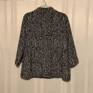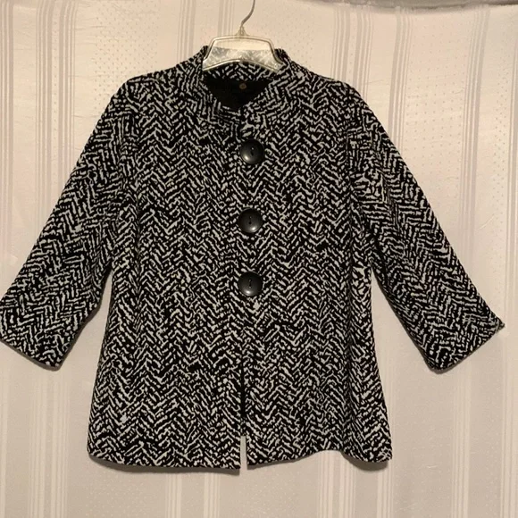 Stylish,versatile jacket in great condition.Black and white chevron print as shown.3/4 sleeves.3 oversized buttons.Classy style