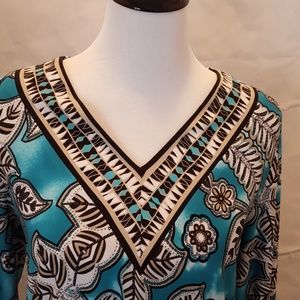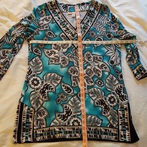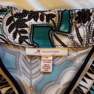 JM Collection top. Beautiful teal black and white design top. Has some stretch to it and can go with any sort of pants or skirt