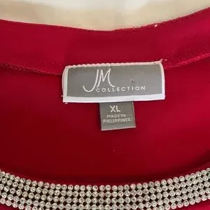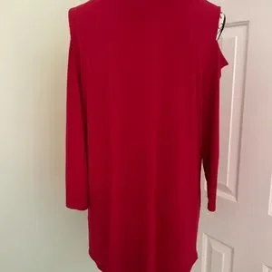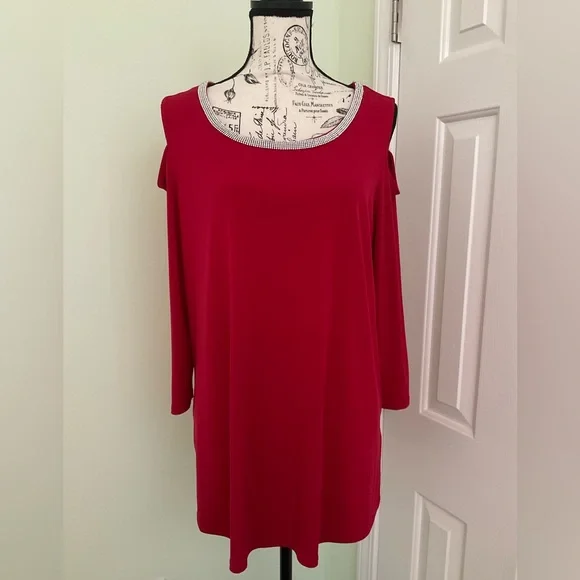 JM Collection red cold shoulder tunic top with 3/4 sleeves and has a CZ scoop neckline.