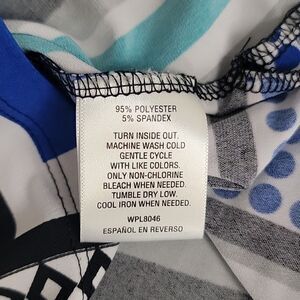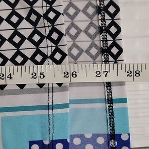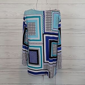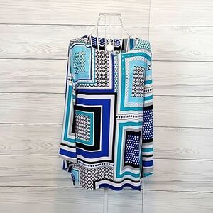 A lovely geometric print tunic top by JM Collection with a round neckline, kimono sleeves, and a hi lo split hemline. Great pre-owned condition.