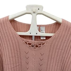 JM Collection Pink Ribbed Knit Crochet Trim Round Neck Long Sleeve Top Large