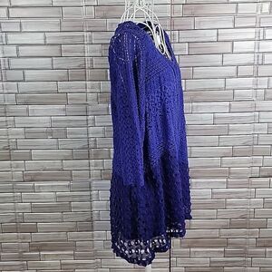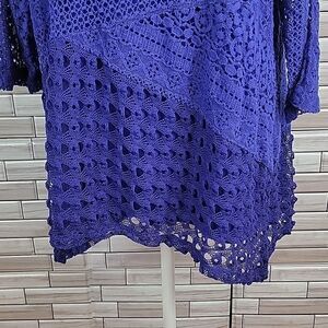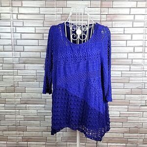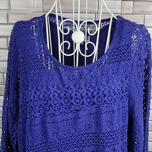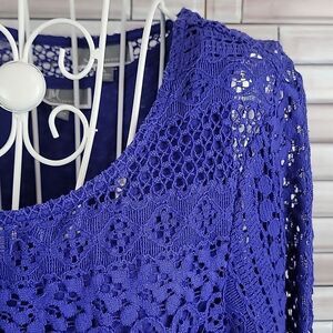 Polyester rayon blend royal blue crocheted top by JM Collection with a tank lining, 3/4 sleeves, and a round neckline. Great pre-owned condition.