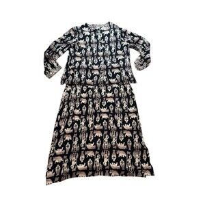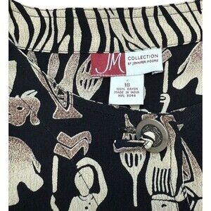 The JM Jennifer Moore VTG 2 Piece Skirt Blouse Set in tribal Egypt print is a stylish and versatile outfit for plus size women. The set includes a long sleeve dress shirt and a skirt, both made of blended rayon fabric for comfort and durability. The black animal print pattern adds a touch of nature-inspired glamor to the outfit, suitable for various occasions such as travel, parties, casual outings, workwear, and business meetings. With a vintage flair and a blend of art, bohemian, and tribal themes, this outfit is perfect for women who love unique and eye-catching fashion pieces.