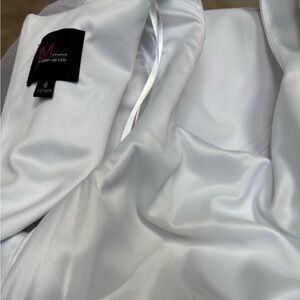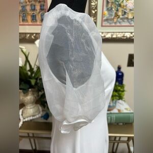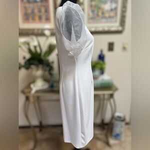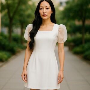 Gorgeous , dressy, white dress featuring stylish sheer puff sleeves, completely lined hidden back zipper , tailored, machine washable. Midi in length. Beautiful dress for all your upcoming social events this holiday season ,or a beach wedding . Simple yet so elegant. Brand new with tags!