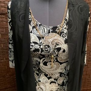 JM Studio by John Meyer 2 pc woman dress with sheer jacket size 2X polyester 95% spandex 5% necklace is included. Black, White & Beige.