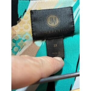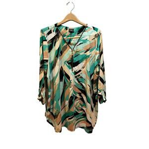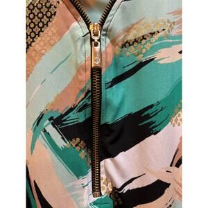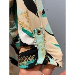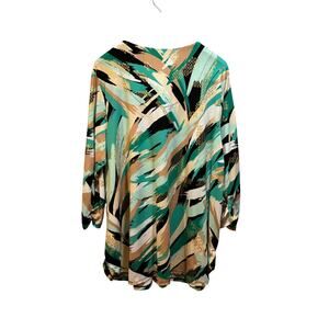 Good preowned condition, gold accents, 1/4 zip 3/4 length sleeves with gold buttons. Lightweight polyester. Size 3x… bust 49”, length 29”