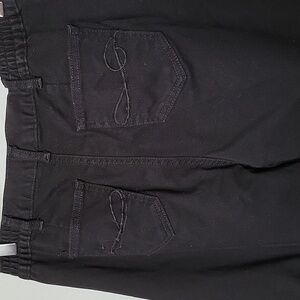 No fading. Great condition. Waist has a little bit of elastic for stretch. Button and zipper closure. Appears to be a straight leg fit or just a little tiny bit of a taper towards the bottom. Please note this item does have a perfume-y scent. I washed with scent free detergent however the scent remained.