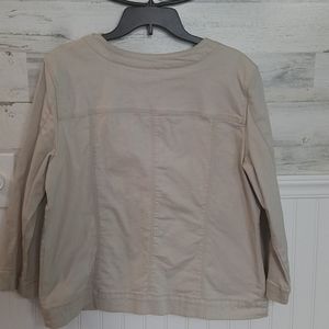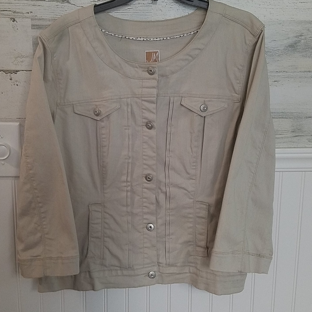 Tan JM jacket, lightweight and flexible denim, buttons are silver tone with crystal accent, length from shoulder to hem is 24" great to wear with sleeveless summer dress on a chilly evening