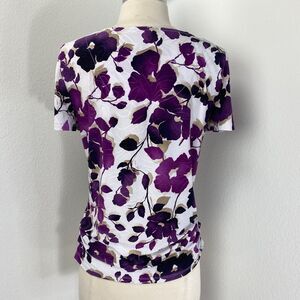 JM purple Floral Stretch Top Med Ruched Sides Cottagecore Boho Whimsy Fairy
