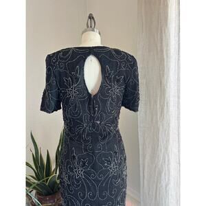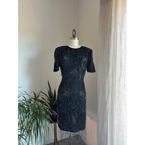 Stunning vintage black cocktail dress with intricate all-over beadwork in swirling floral and starburst motifs. This 1980s/early ’90s piece channels Art Deco glamour with its body-skimming silhouette, padded shoulders, and fully lined construction. Perfect for a formal event, evening out, or holiday party.