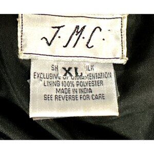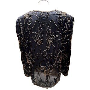 JMC vintage beaded silk jacket in XL. Black silk shell with gold beaded scrolls and sequined floral motifs, fully lined. Late 1980s–early 1990s cocktail glam piece.
