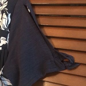 Blue and white JM Collection top. Size reads small but fits like medium. Longer pleated and tropical pattern back. Front is a soft jersey material with tropical piping at neck. Sleeves are slit from shoulder and tie at end. These would pair nicely with jeans. Very good condition.