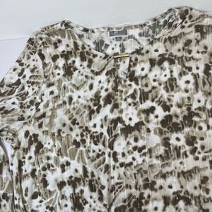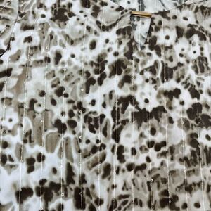 JM Collection in cream and brown splatter print, with sequined accents all throughout, complete with gold bar key hole neck accent.
