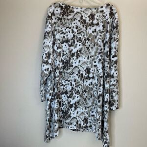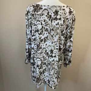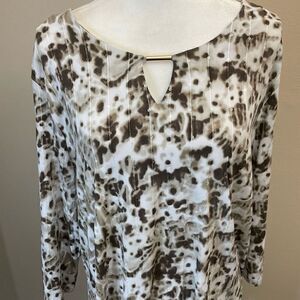 JM Collection in cream and brown splatter print, with sequined accents all throughout, complete with gold bar key hole neck accent.