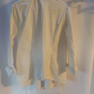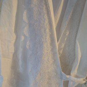 white, long sleeves, lace trimmed wrap shirt. pit to pit 25" length 26"