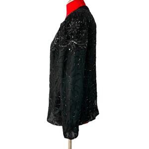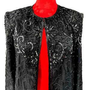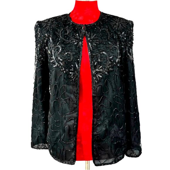 JMD New York vintage black silk cocktail jacket - size S - beads & sequins exterior on sheer long sleeve jacket - original store tag attached - this jacket is circa 1980's NEW OLD STOCK. Open front with a single hook clasp at the neckline - shoulder pads add a fantastic vintage shape to this piece. Clearly tagged - in excellent vintage condition - no apparent damage or flaws - just stunning!