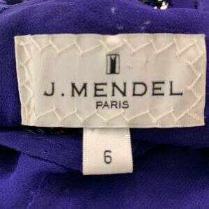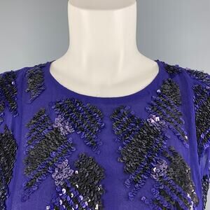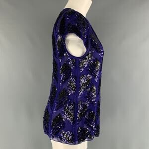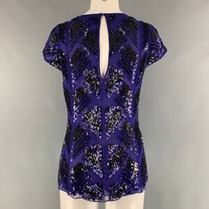 J.MENDEL blouse comes in purple silk woven material featuring cap sleeves and sequins embroidering. Made in USA.