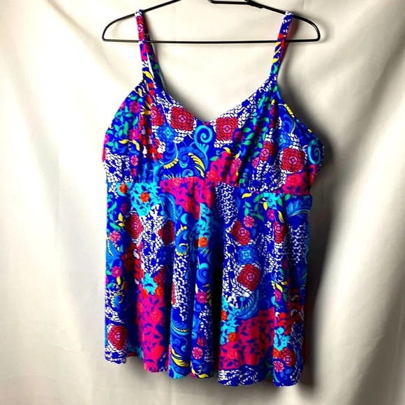 JMS JUST MY SIZE WOMENS SWIM TOP SIZE 22W ROYAL BLUE FLORAL PRINT UNDERWIRE BRA ADJUSTABLE STRAPS VERY GOOD CLEAN CONDITION TOP LENGTH MEASURES APPROX 29” FROM SHOULDER TO HEM CHEST MEASURES APPROX 22” FROM SIDE TO SIDE
