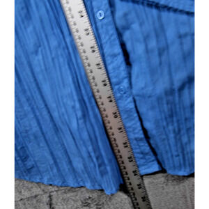 This JMS (Just My Size) crinkle-textured button-up shirt features a lightweight fabric in a soft blue tone, ideal for layering or standalone wear. Designed for plus-size women, it offers long sleeves and a relaxed silhouette for comfort and versatility. Note: the top button is missing, but all others are intact. Fabric is textured and wrinkle-resistant, great for casual or travel wear. No holes, stains, or discoloration. Measurements provided in photos.