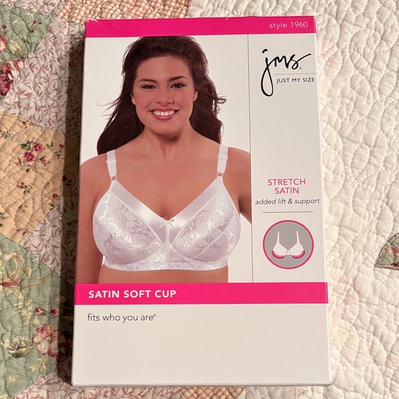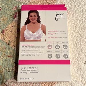 This Just My Size bra JMS is a size 44B, white in color. NIB. Removed for pics only. Please see all pics. From a clean, smoke free home.