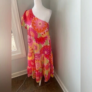 J.Marie Leilani Sz XL Bold Zinnia Floral One Shoulder Tiered Midi Dress Colorful