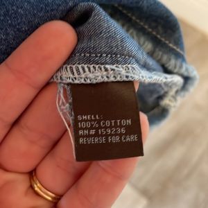 Denim short sleeve dress by J. McLaughlin. Raw edge hem on sleeves and on dress. Button down neckline - collared neckline. Pockets on sides. Total length measures 37.5 inches. Size small.