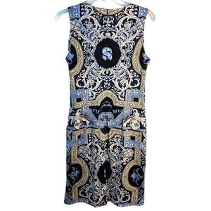 J McLaughlin Ladies Sheath Dress Small Blue Yellow White Print Catalina Knit